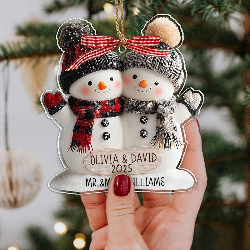 Celebrate your first holiday season as a married couple with this adorable snowman ornament! Featuring a pair of cozy snowmen dressed in festive winter attire, it’s personalized with your names and the year to mark this special milestone. The heartwarming "Merry & Married" message makes it a perfect keepsake or gift for newlyweds. Add a touch of love and joy to your holiday decor with this charming ornament!