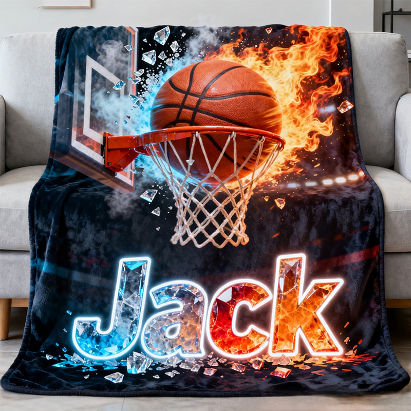 Personalized Basketball Blanket with Fiery Hoop Design and Custom Name for Players and Enthusiasts