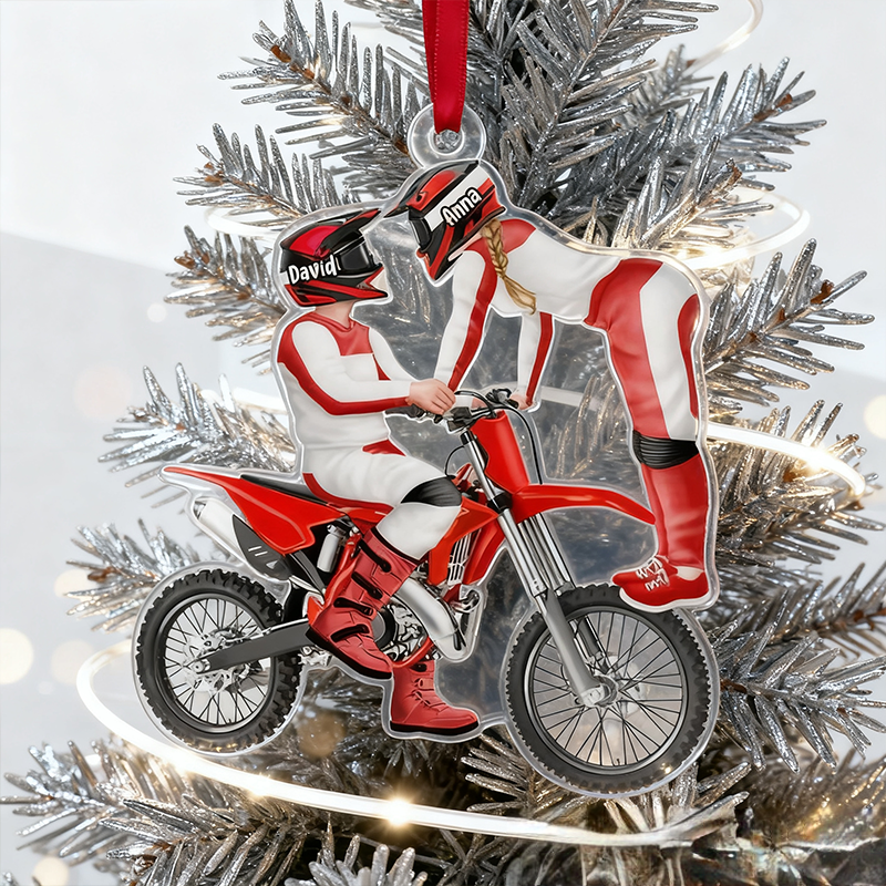 Celebrate your love for adventure and each other with this personalized dirt bike-themed Christmas ornament! Featuring a couple in matching red and white riding gear, the ornament showcases a unique design with one partner standing on the bike while the other sits holding the handlebars.